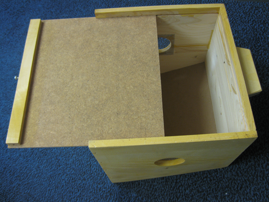 Der Schwarm wird mittels verschiebbarer Bodenplatte eingefangen. Diese Kiste aus leichtem, stabilem Holz, ist leicht und einfach zu bedienen. Seitlich befinden sich vergitterte Belüftungsöffnungen. An der Vorderseite befindet sich ein verschließbares Flugloch.